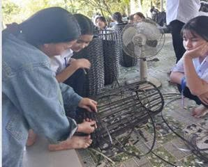 Một hoạt động đáng nhớ trong chuyến đi là trải nghiệm nghề đan nhựa tại một gia đình ở xã Cát Tiên 3. Đây là nghề thủ công giúp nhiều hộ gia đình có thêm nguồn thu nhập, đặc biệt trong thời gian nông nhàn. Dưới sự hướng dẫn tận tình của chủ nhà, các em học sinh được trực tiếp thử sức với những thao tác đan nhựa để tạo thành các sản phẩm gia dụng đơn giản.